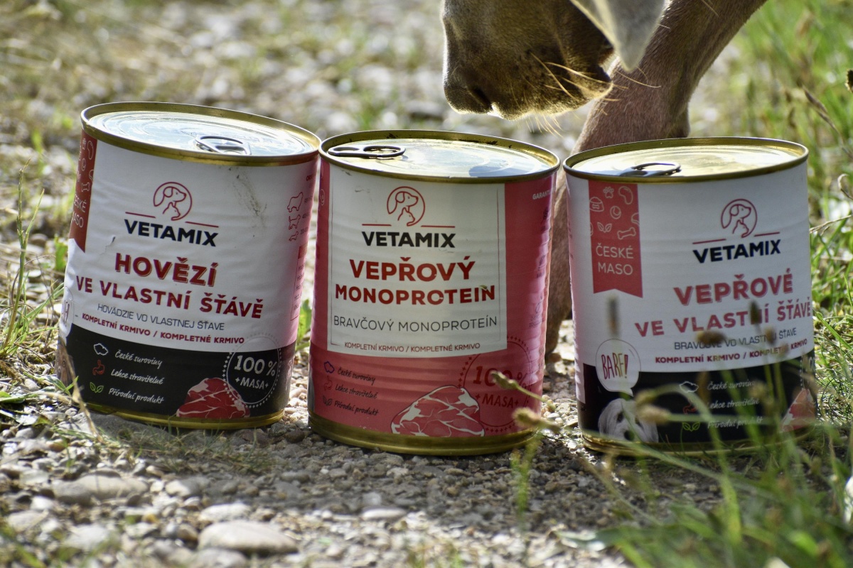 Ale i tohle vše lze zcela snadno vyřešit pomocí připravených konzerv od Vetamixu. Třeba řada „Ve vlastní šťávě“ obsahuje pouze 100% prémiovou svalovinu v lahodné omáčce. Je čistě přírodní, bez éček, lepku a dalších chemických přísad. Stačí ji otevřít a rovnou servírovat.