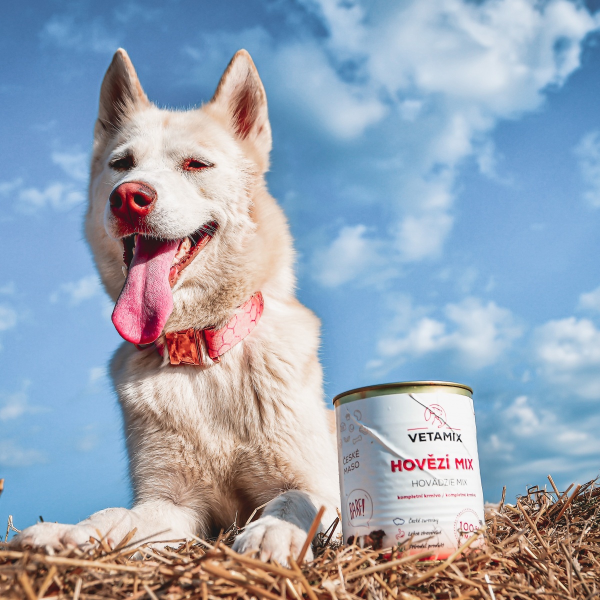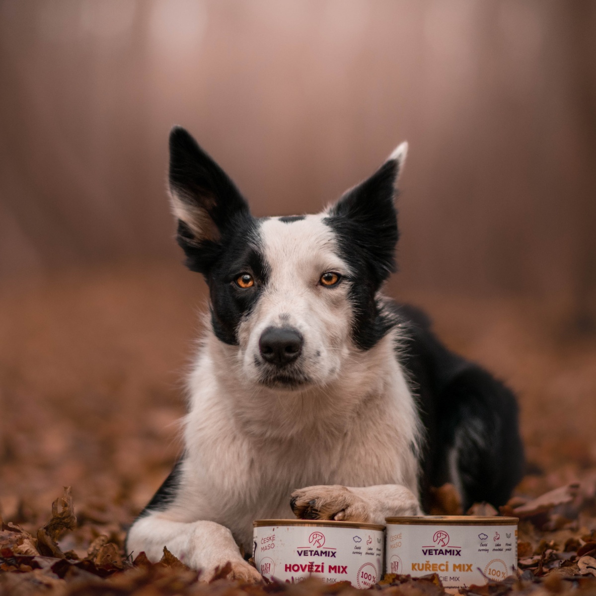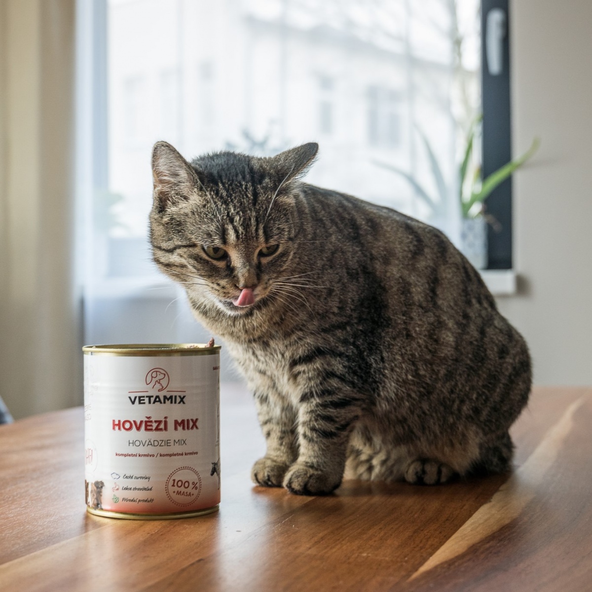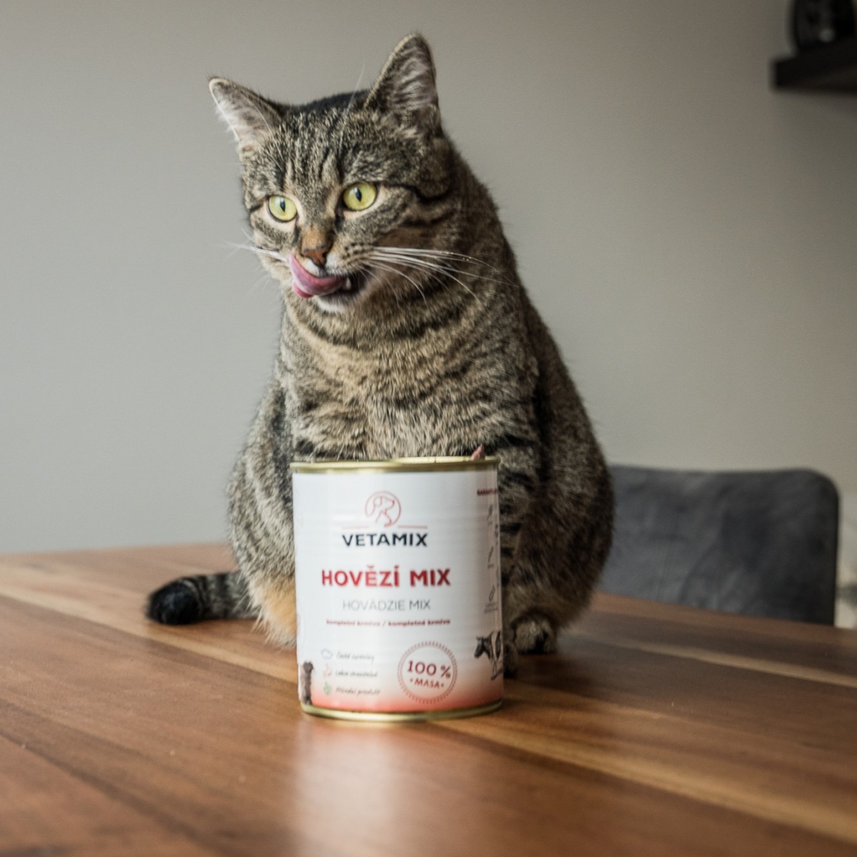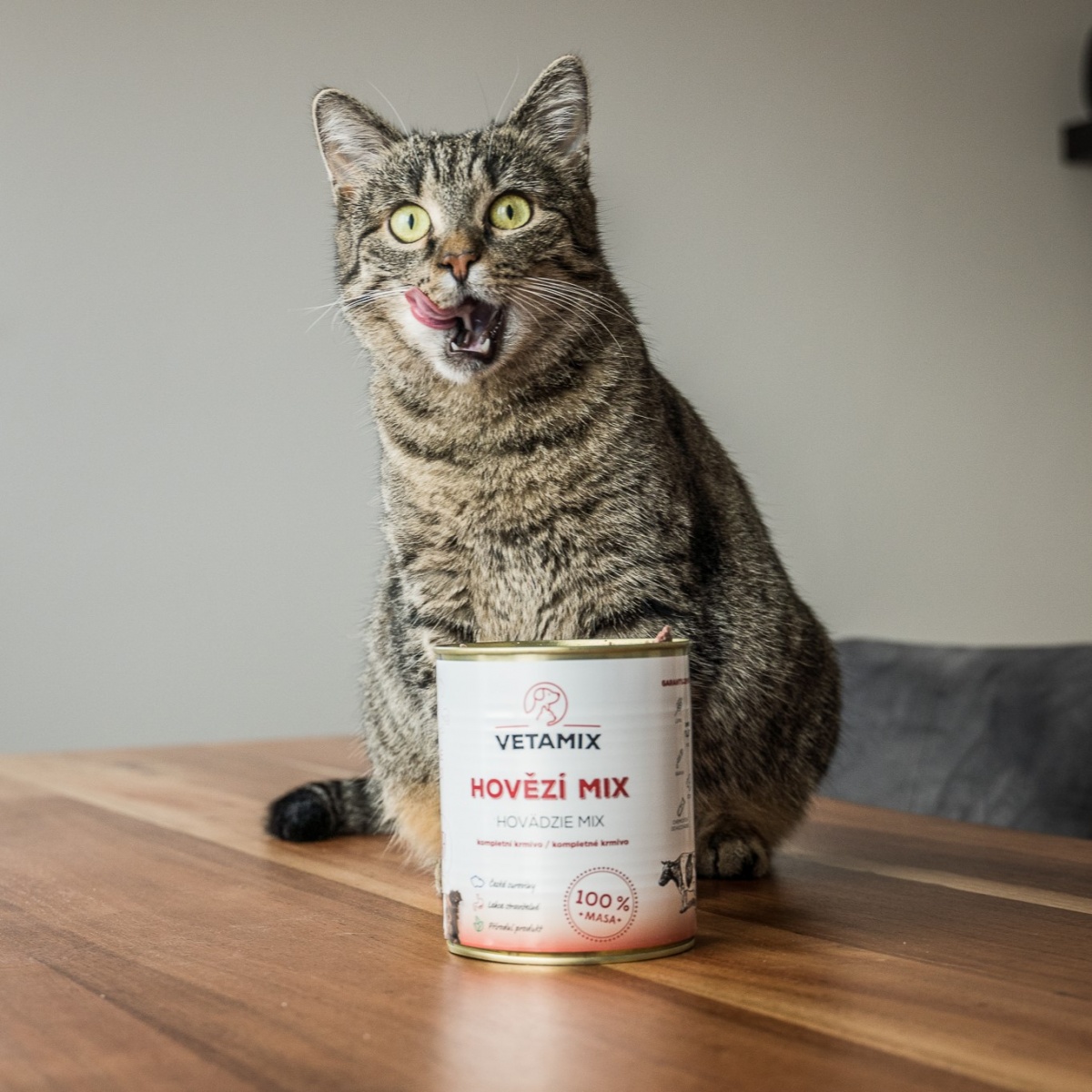 Série konzerv "MIX" obsahuje vždy 40 % převažujícího druhu svaloviny ve vyváženém poměru s dalšími druhy masa, droby a jemně namletými kostmi.