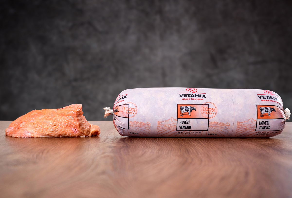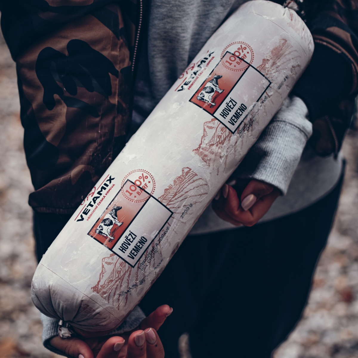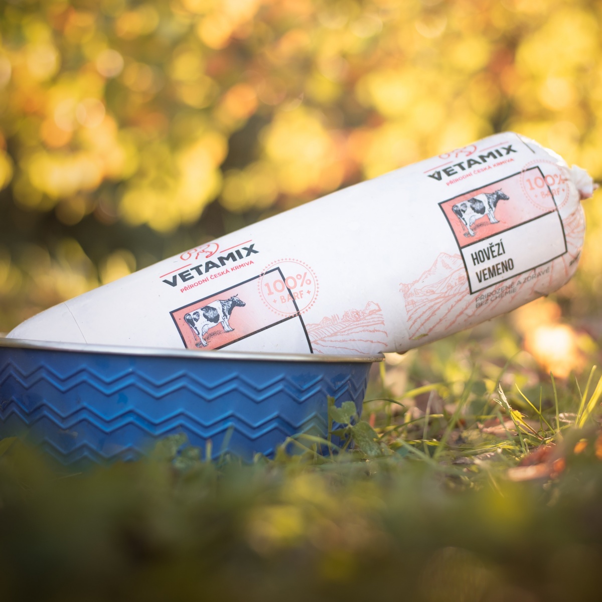 Hovězí vemeno je výživově hodnotné krmivo, obsahuje zbytky mléka a vysoký poměr vápníku. Zařaďte ho do BARF menu také větším plemenům, kojícím fenám nebo větším štěňatům.