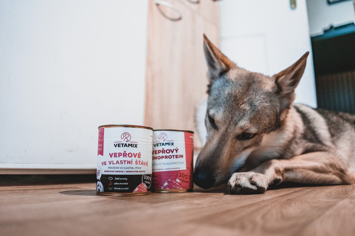 Pokud byste ale neměli možnost takového uskladnění, existuje super alternativa, která je na tom výživově a chuťově (soudě podle rychlosti, jakou to Kraken sní) velmi podobně jako klasický BARF. Můžete objednat Vetamix přírodní masové salámky a konzervy různých druhů (vepřové, drůbeží, hovězí nebo králičí s rýží) a různých velikostí. Jsou to produkty jednoduché na obsluhu. A když je dáte do krabice, aby se vám všude nekutálely, tak i na skladování, protože v pohodě snesou pokojovou teplotu.