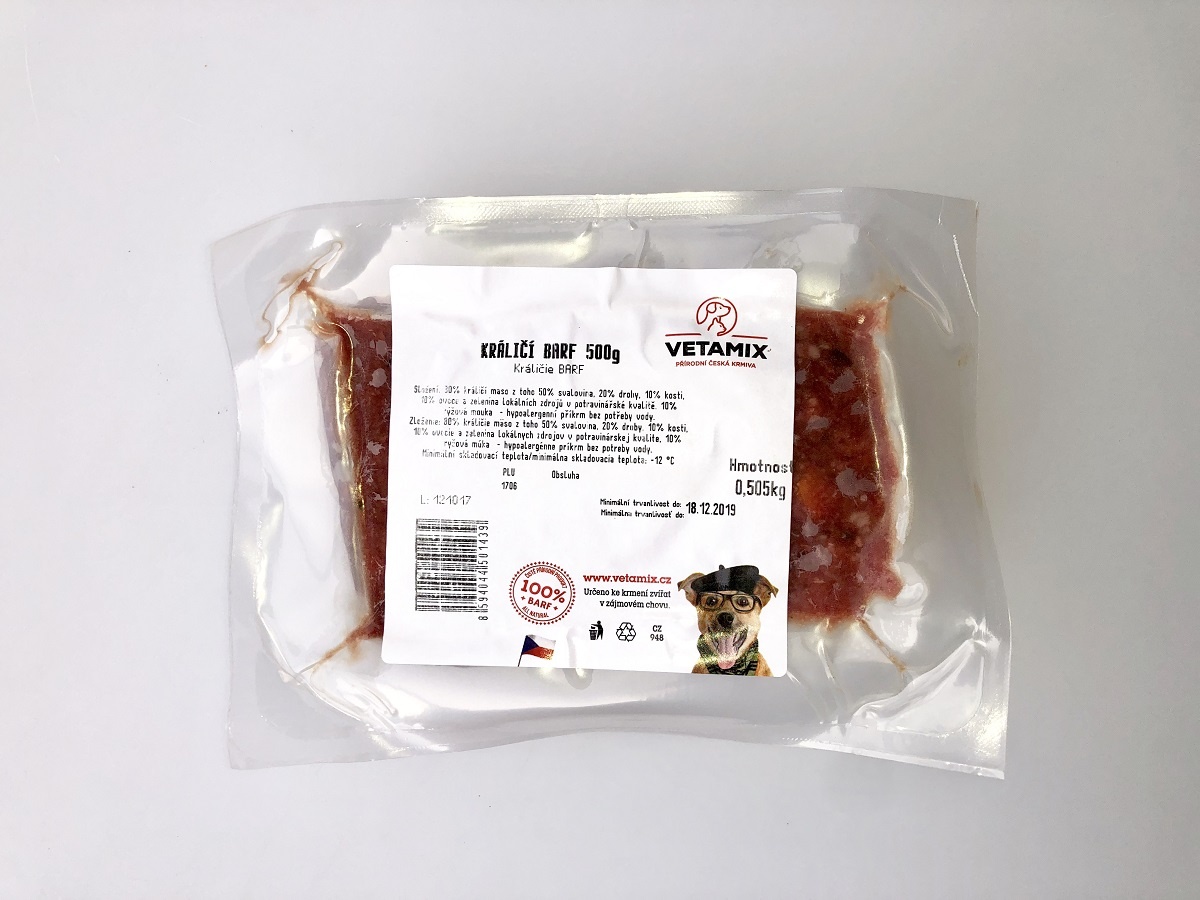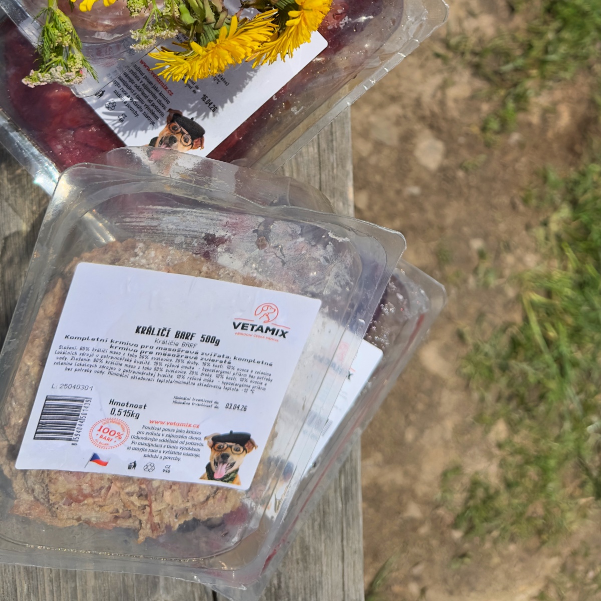 Náš Králičí BARF obsahuje kvalitní lehce stravitelné králičí maso bohaté na bílkoviny v ideálním poměru svalovina, droby a měkké kosti. To jsme ještě doplnili o kvalitní ovoce a zeleninu z českých zahrad a rýžovou mouku, která je vhodným hypoalergenním příkrmem.
