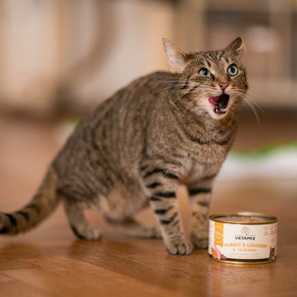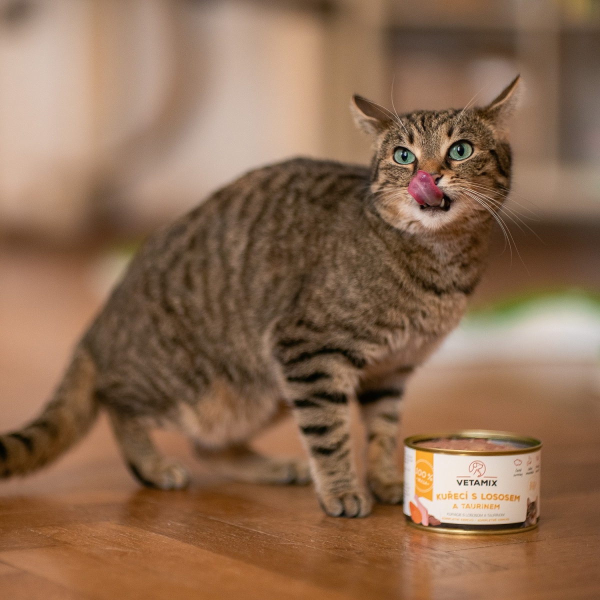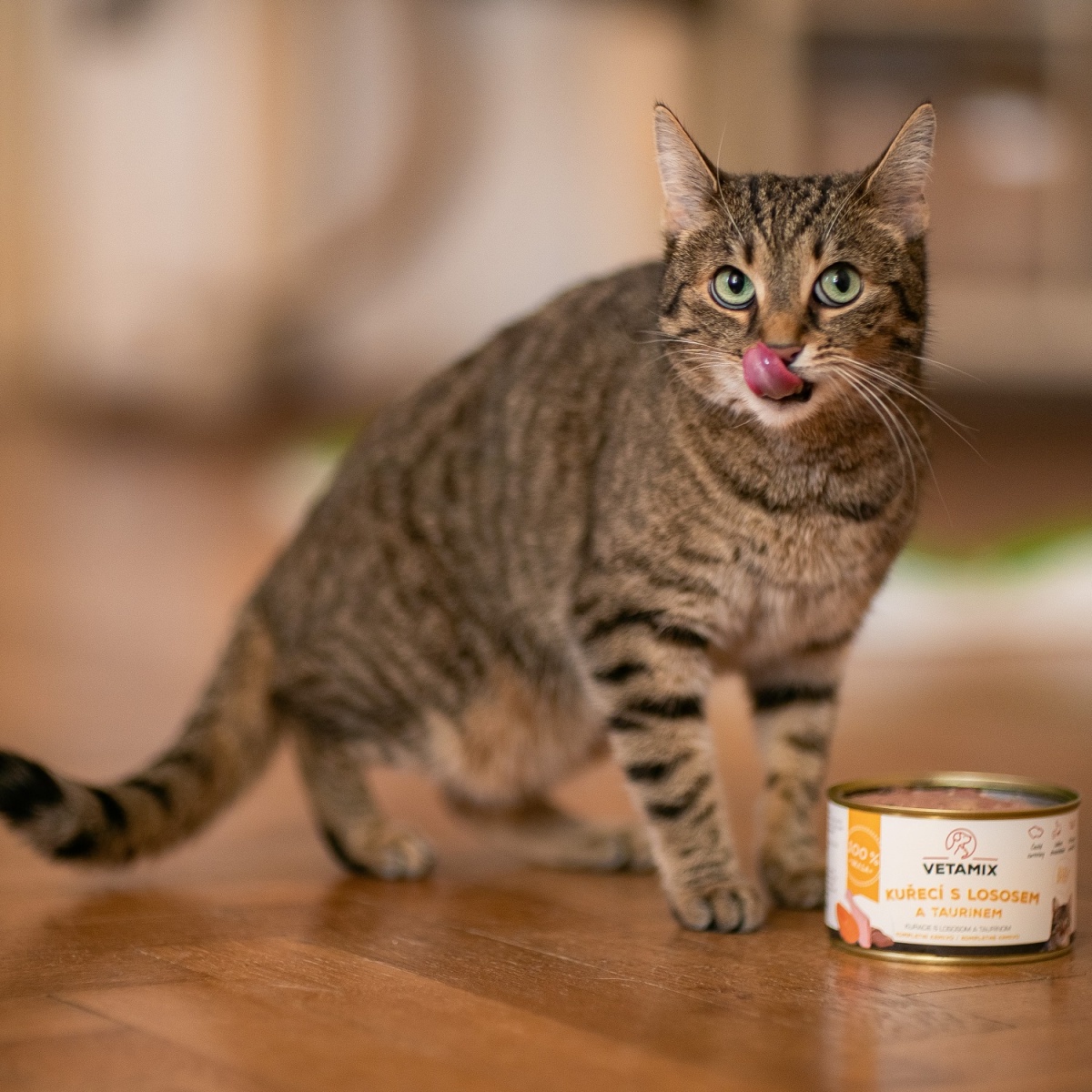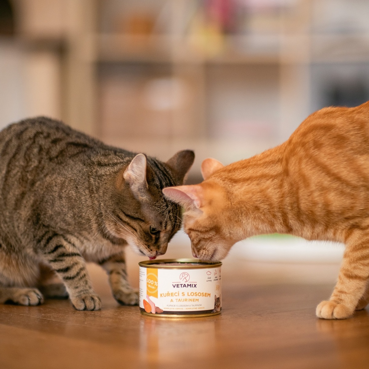 KUŘECÍ S LOSOSEM A TAURINEM obsahuje lehce stravitelné české kuřecí maso namíchané ve vyváženém poměru s lososem doplněné pro zdraví koček nezbytný taurin. Produkt je zcela přírodní, bez éček, lepku a dalších chemických přísad. Dopřejte ho i psům a kočkám na dietě nebo se zažívacími problémy.