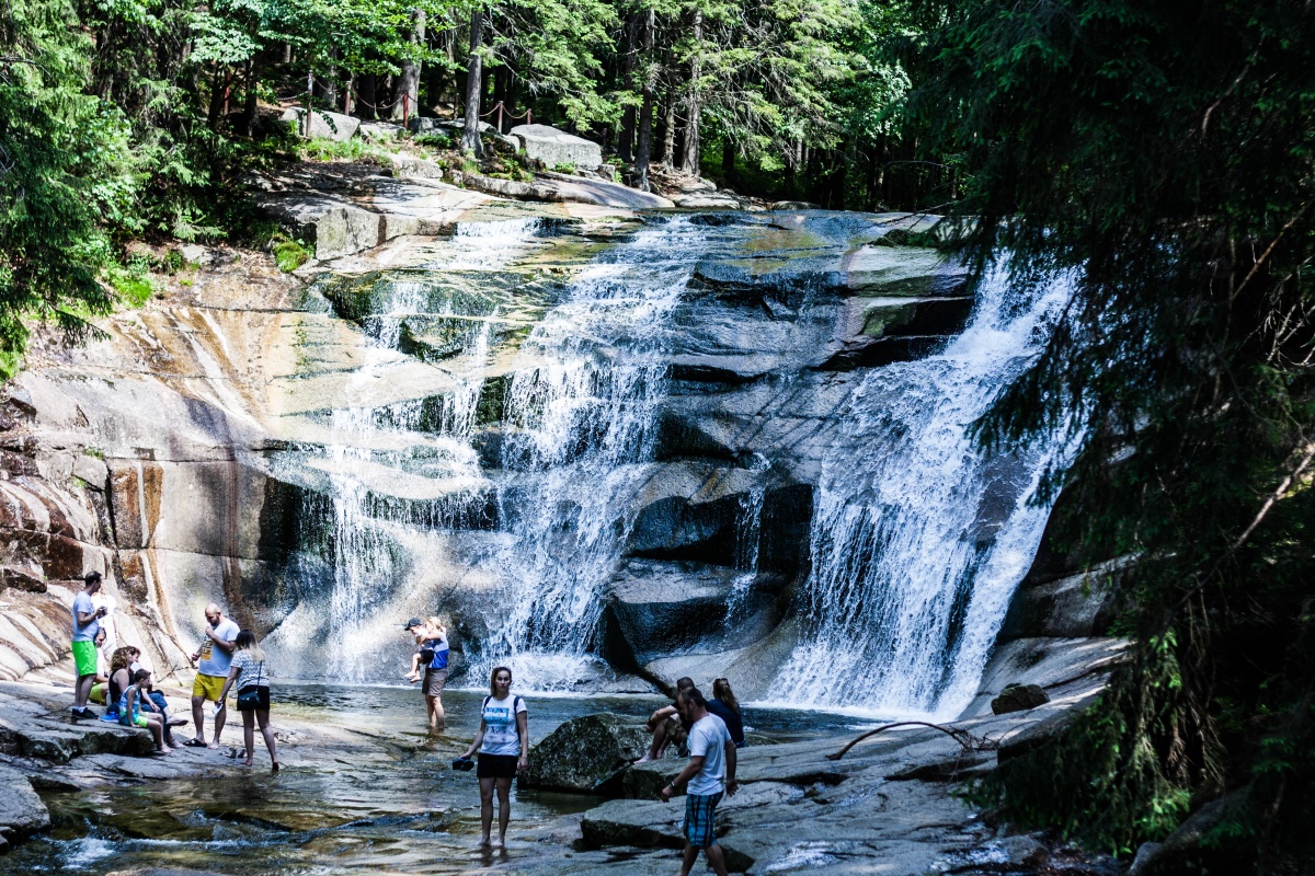 Poté jsme se rozhodli vydat k Mumlavským vodopádům. Původně jsme měli v plánu jít pěšky. Ale jelikož jsme po předchozí zkušenosti nedůvěřovali naší GPS navigaci, která zase psala, že cesta trvá hodinu a půl, tak jsme raději nasedli do autobusu. Zrovna, když jsme měli vystupovat, tak se Tobby pozvracel. Byla jsem přesvědčená, že s sebou mám sáčky, protože je přece vždycky beru. Jenže jako na potvoru sáčky zůstaly po naší ranní příhodě v hotelu na koberci. Takže mi nezbylo nic jiného než vysypat sušené plíce od Vetamixu do batohu a použít tuhle nouzovou variantu. Při úklidu mě provázeli soucitné pohledy spolucestujících, protože jsem asi byla totálně bílá. Trochu jsem se chvíli bála, že Tobby tu za chvíli nebude jediný tvor, kterému je na zvracení.