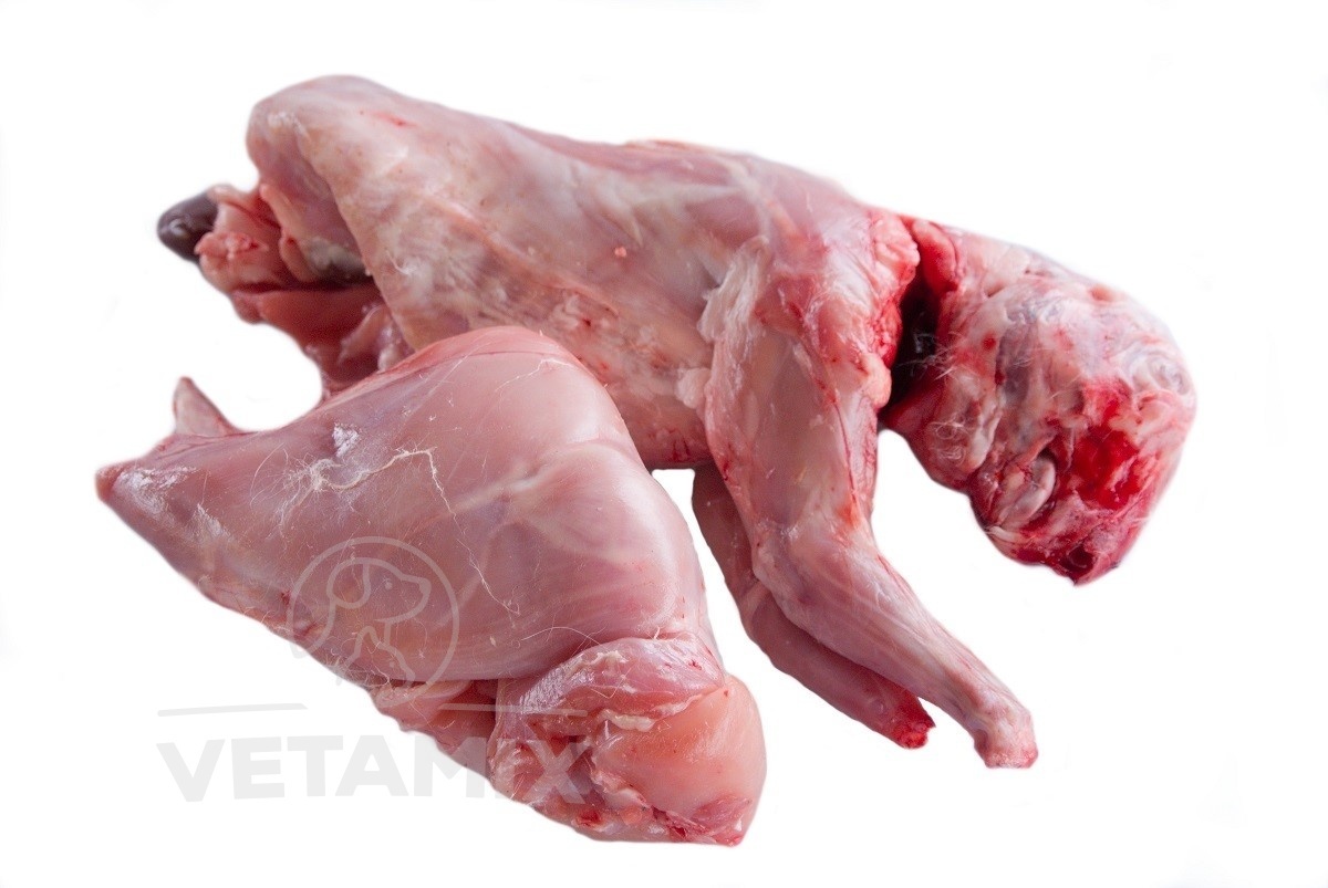 Kvalitní, lehce stravitelné králičí maso bohaté na hodnotné bílkoviny namleté s najemno s kostmi a droby.