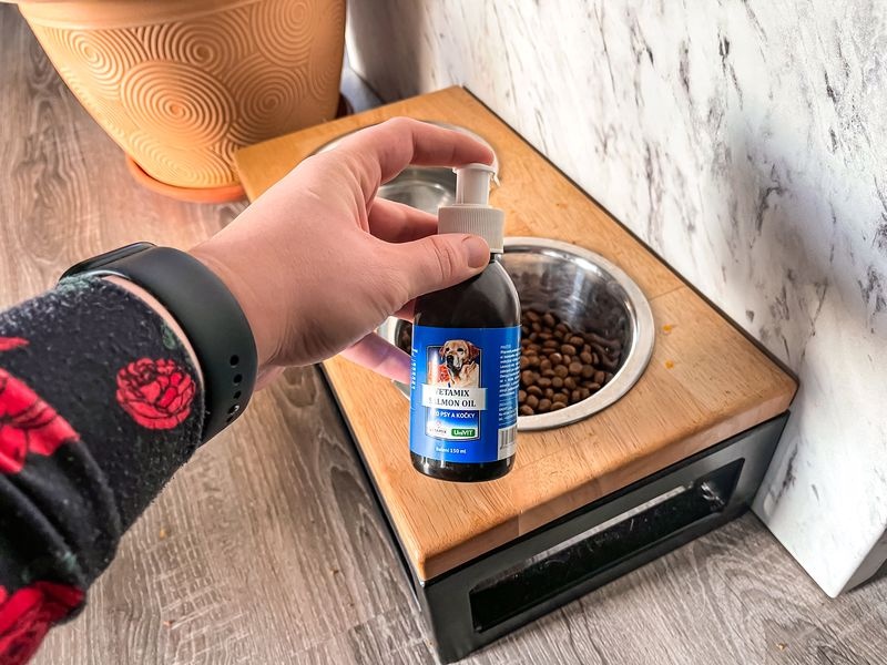 - Produkt přidávám Ellie do jídla, cca jednu až dvě pumpičky. Zamíchám a může se baštit.
