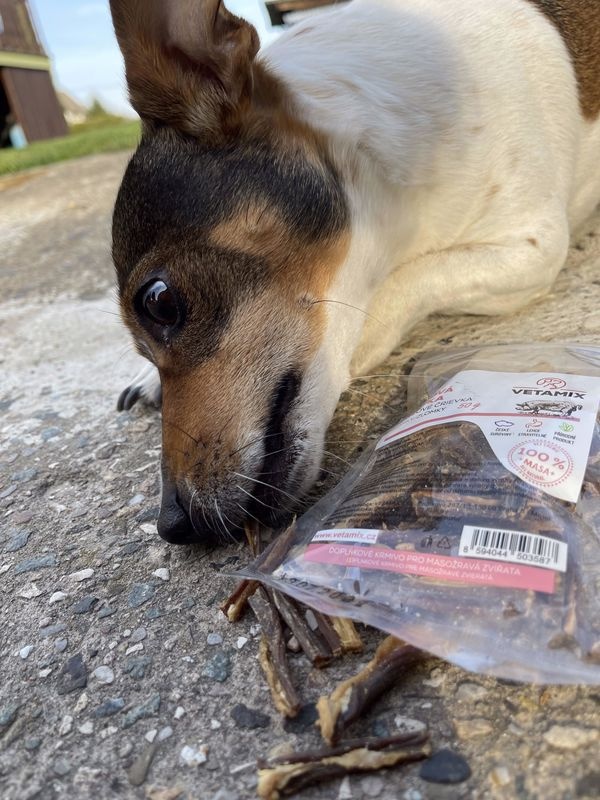 Ale spíše bereme ty zlomky, ty už jsou „nalámané", a tak je to lepší v tom, že je nemusím lámat a hned se můžou podávat jako odměna. Pro Elli jsou střívka velká a chutná odměna, opravdu je miluje.