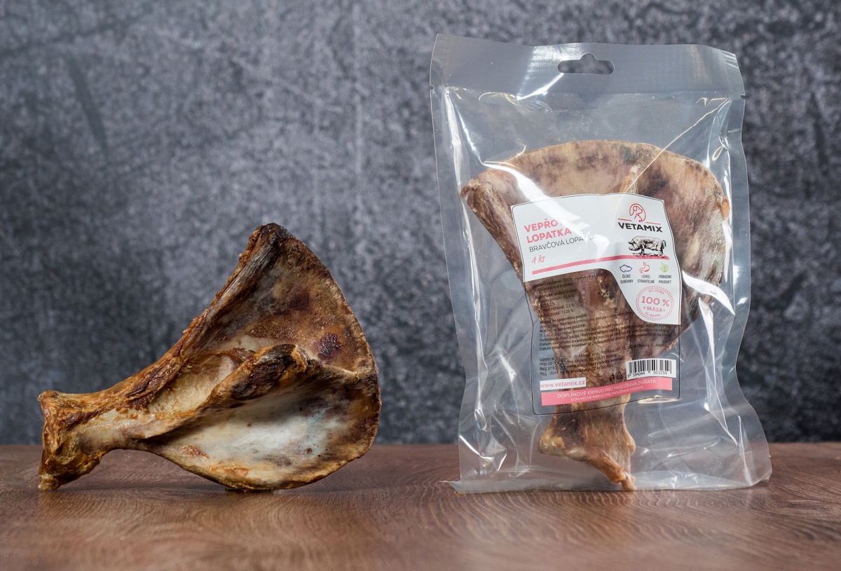 Lahodná sušená vepřová lopatka se zbytky masa zabaví skvěle vašeho chlupáče a dodá mu potřebné důležité látky.