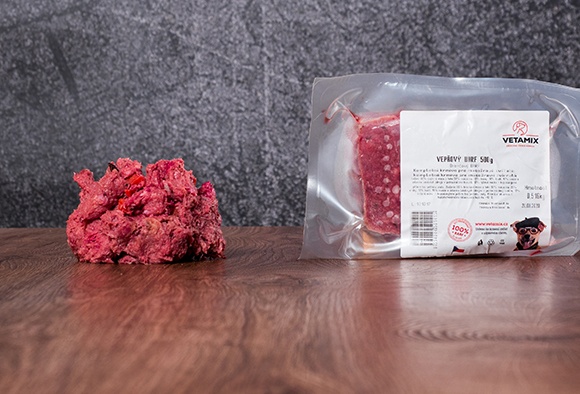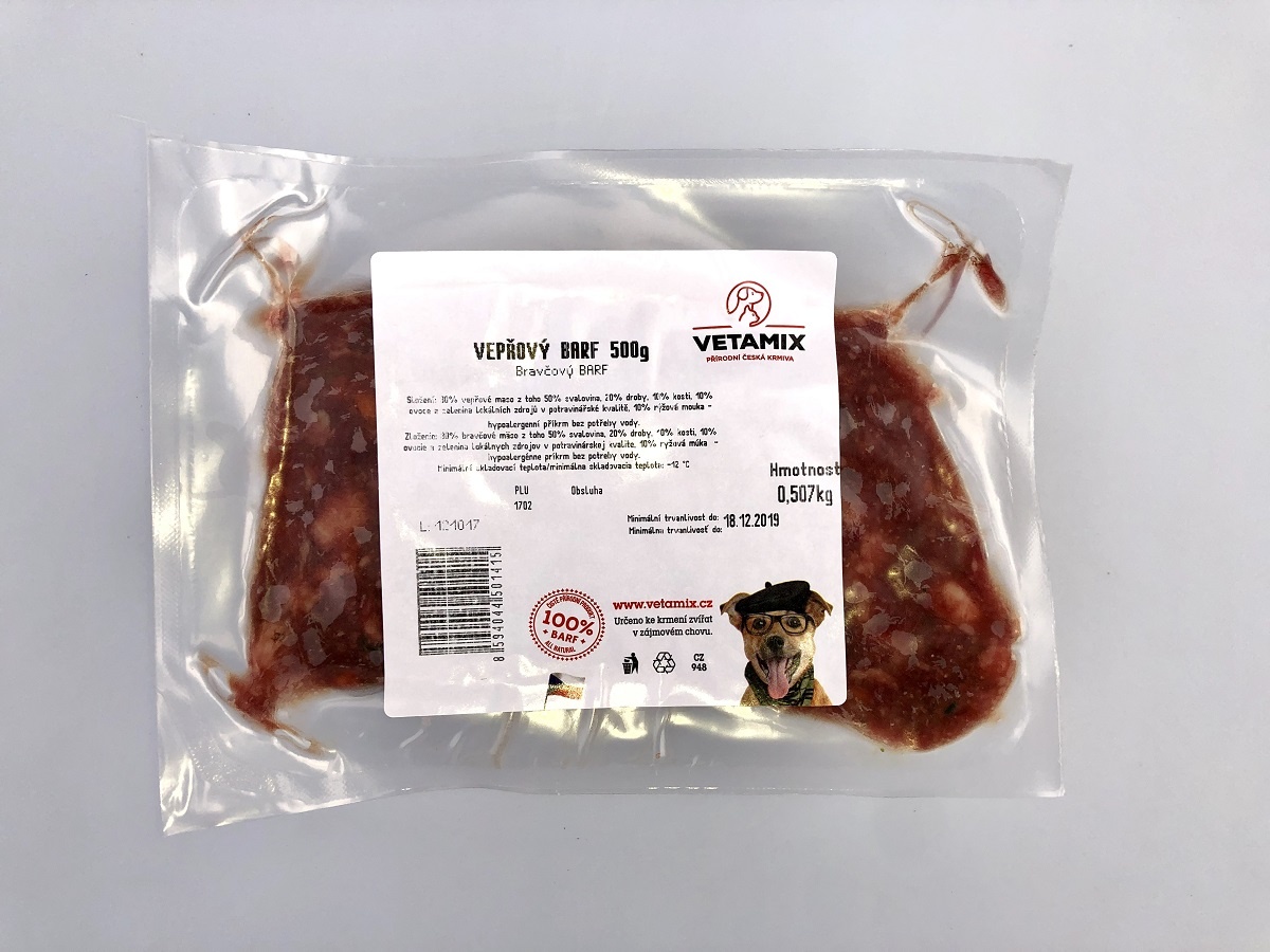 Náš Vepřový BARF obsahuje kvalitní vepřové maso bohaté na výživné tuky v ideálním poměru svalovina, droby a měkké kosti. To jsme ještě doplnili o ovoce a zeleninu z českých zahrad a rýžovou mouku, která je vhodným hypoalergenním příkrmem.
