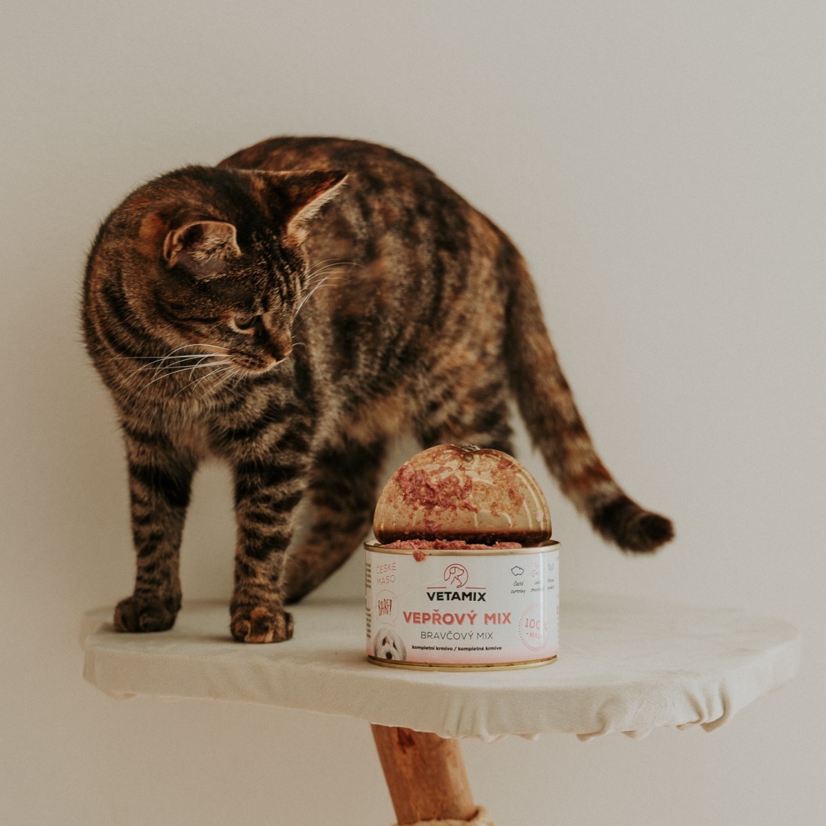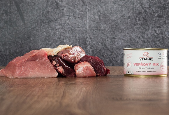 VEPŘOVÝ MIX obsahuje prémiové, výživné, vepřové maso namíchané ve vyváženém poměru s hovězí a kuřecí svalovinou, droby a jemně namletými kostmi. Produkt je zcela přírodní, bez éček, lepku a dalších chemických přísad. Dopřejte ho i psům a kočkám na dietě nebo se zažívacími problémy.