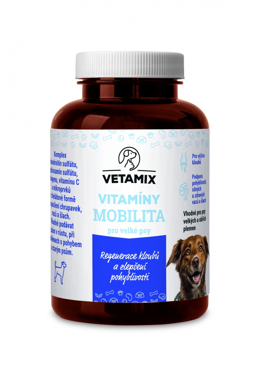 Přihoďte chlupáčovi do misky vitamíny Vetamix Mobilita, které jsou zdrojem komplexní kloubní výživy pro regeneraci a ochranu chrupavek, vazů a zlepšení hybnosti kloubů během jejich vývoje, růstu a běžného namáhání u rostoucích a zdravých psů. Nebo jako součást léčby degenerativního onemocnění kloubů (osteoartritis) k potlačení zánětlivých procesů, úlevě od bolesti a zlepšení hybnosti kloubu.
