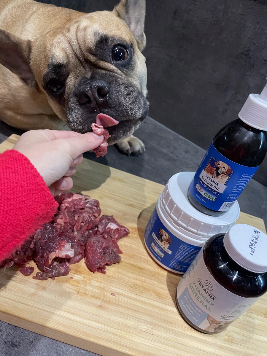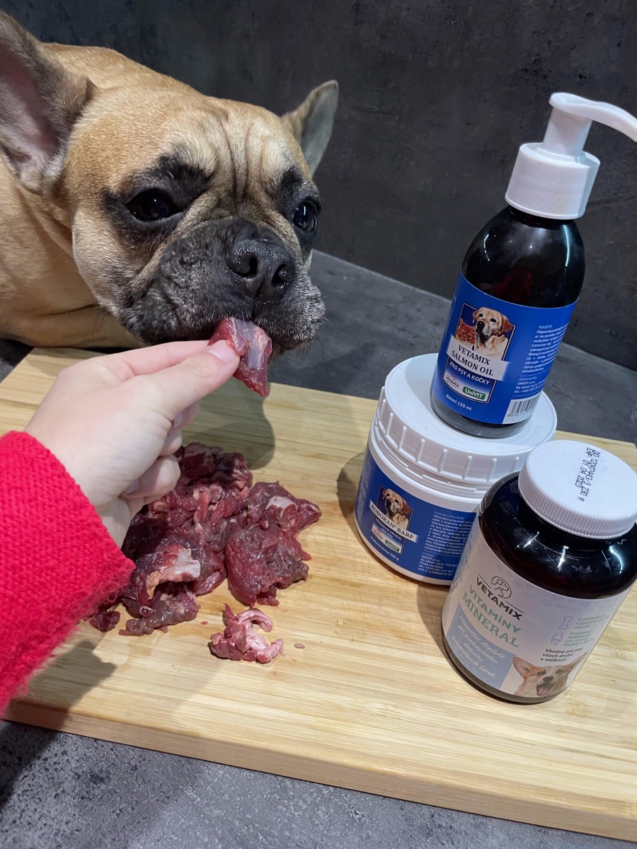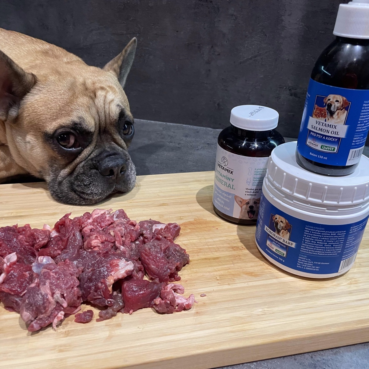 Vitamíny a další doplňky přidávám vždy do jedné krmné dávky obvykle ráno před tím, než společně vyrazíme do práce. U doplňků jako jsou oleje, oříšky či kvasnice se řídím zkušenostmi a odhadem, avšak u vitamínů a doplňků kupovaných se vždy řídím pokyny na obalu a obvykle ještě o něco ubírám. Obecně se v tomto ohledu snažím řídit pravidlem, že méně je více. Na toto bychom neměli nikdy při přípravě misky pro svého parťáka zapomínat. 😊