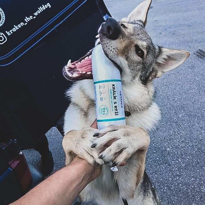 Protože jsme spali v dodávce, neměli jsme přístup k ledničce, abychom s sebou vzali maso na B.A.R.F., které Kraken běžně jí. Na cesty s sebou vozíme nejčastěji salámky, které obsahují maso i přílohu, pro Krakena je to přesně denní dávka, takže nemusíme řešit ani žádné krabičkování. Jako alternativu občas bereme konzervy, kde vybíráme naopak jenom masové.