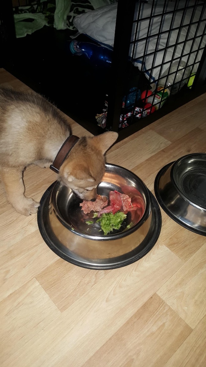 Ale hlavně je to samozřejmě i kupa radosti, roztomilosti a lásky. Třeba když nostalgicky koukáme na fotky, jako je tahle. Kraken jí poprvé u nás doma ze své misky. ☺ Konkrétně jde o mleté maso, kosti a okurku. Tenkrát se dal ještě vyfotit, protože nevěděl, jak se s tím poprat a jestli to chce vůbec jíst. Teď je to spíš tak, že než se sehnete pro foťák, tak je miska prázdná.