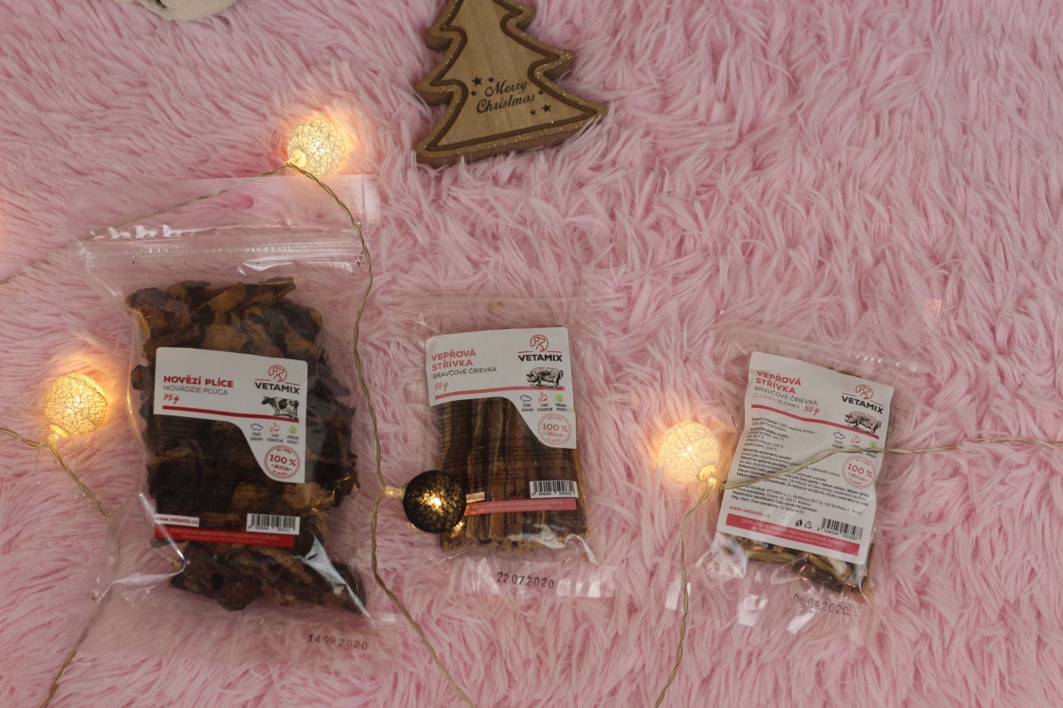 Začneme tým najzásadnejším, a to sú maškrty. Ktorý psík by nemal rád maškrty! Napríklad moja Ellie hneď ako počuje šuchotanie vrecka, vie, že ju čaká dobrôtka. Existuje veľa maškŕt, ktoré môžete psíkovi nachystať pod vianočný stromček. Od sušeného mäsa, cez sušené črievka až po (napríklad) sušenú hovädziu kosť. Vo Vetamixe nájdete práve veľký výber prírodných kvalitných maškŕt. Ellie ich maškrty úplne miluje. Keď chcem istotu, tak sú to sušené držky a sušené črievka, fakt. Tým má psíka jednoznačne na svojej strane.