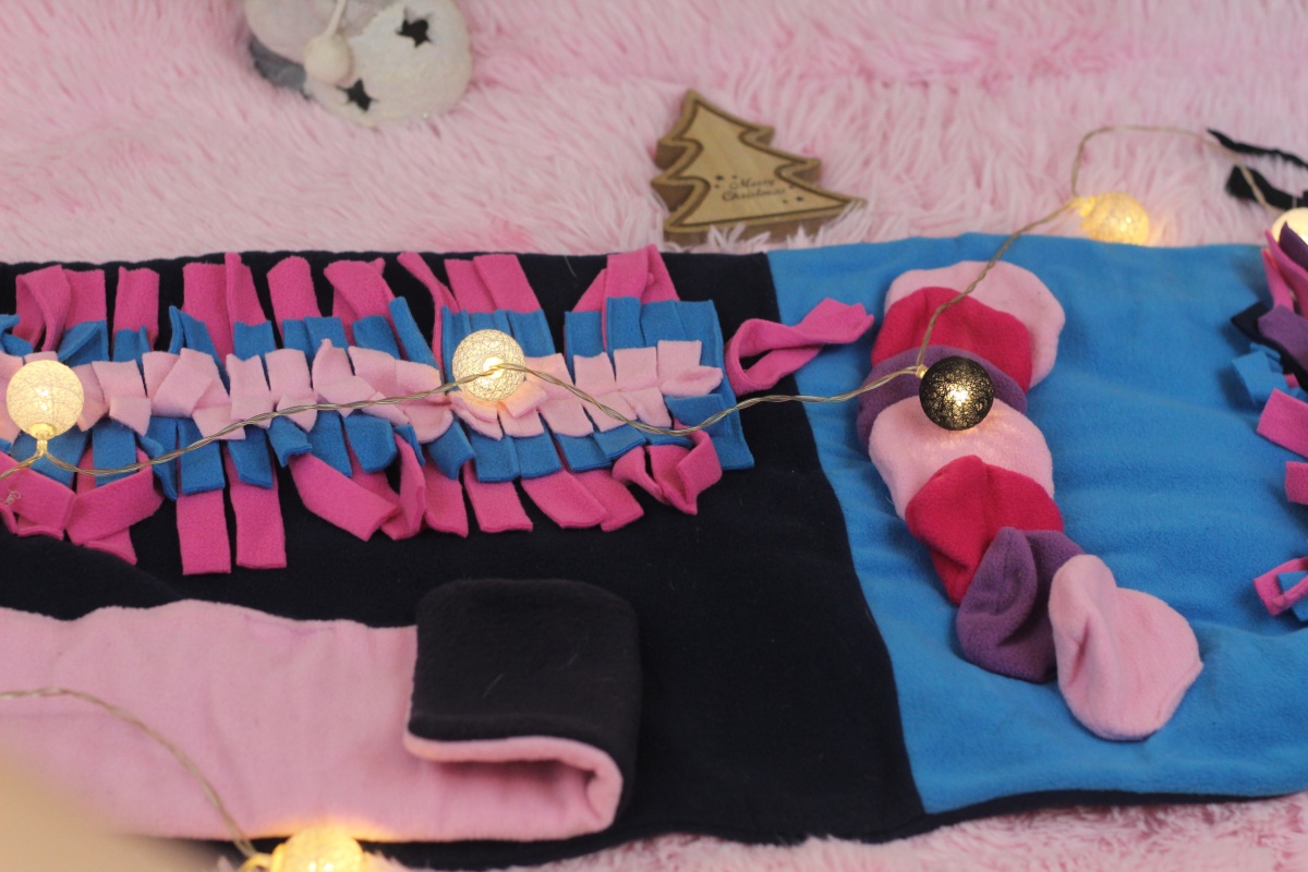 - Koberček na oňuchávanie (náš najobľúbenejší), ktorý zvládnete vyrobiť aj doma. Samozrejme sa dá aj kúpiť, ale prečo do toho nezapojiť aj vlastnú kreativitu. Stačí nejaká staršia handra (deka) a prišiť na ňu vrecká, do nich schovať maškrty a zábava môže začať. Do všetkých týchto hlavolamov sa dávajú maškrty, mám vyskúšané, že najlepšie sú sušené črievka (kúsky) a sušené jerky. Krásne sa do hračiek zmestia a váš psík aspoň poriadne zapojí mozog, aby zistil, ako ich dostať von. No a ako som už písala vyššie, dokonca bude mať aj pochúťku a radosť. Toto rozhodne odporúčam, pretože Ellie potom spinká ako malé šteniatko